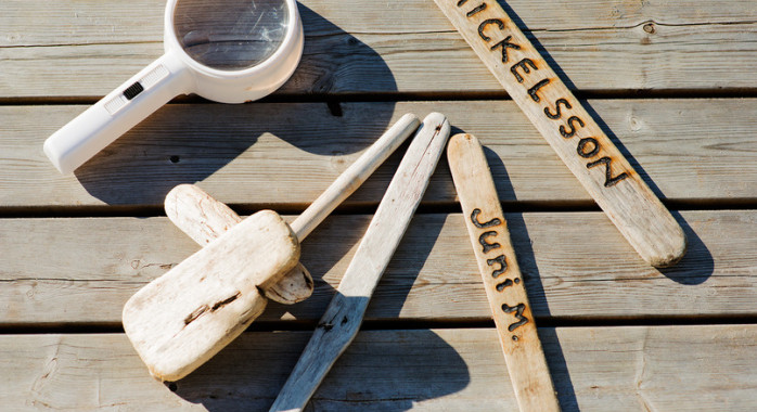 KONST 27/07 2012Mickelsson.nets nya pysselserie inleder ekologiskt med namnskyltar av återvunnet virke med texter graverade med solvärme.