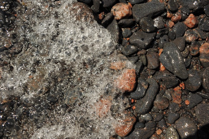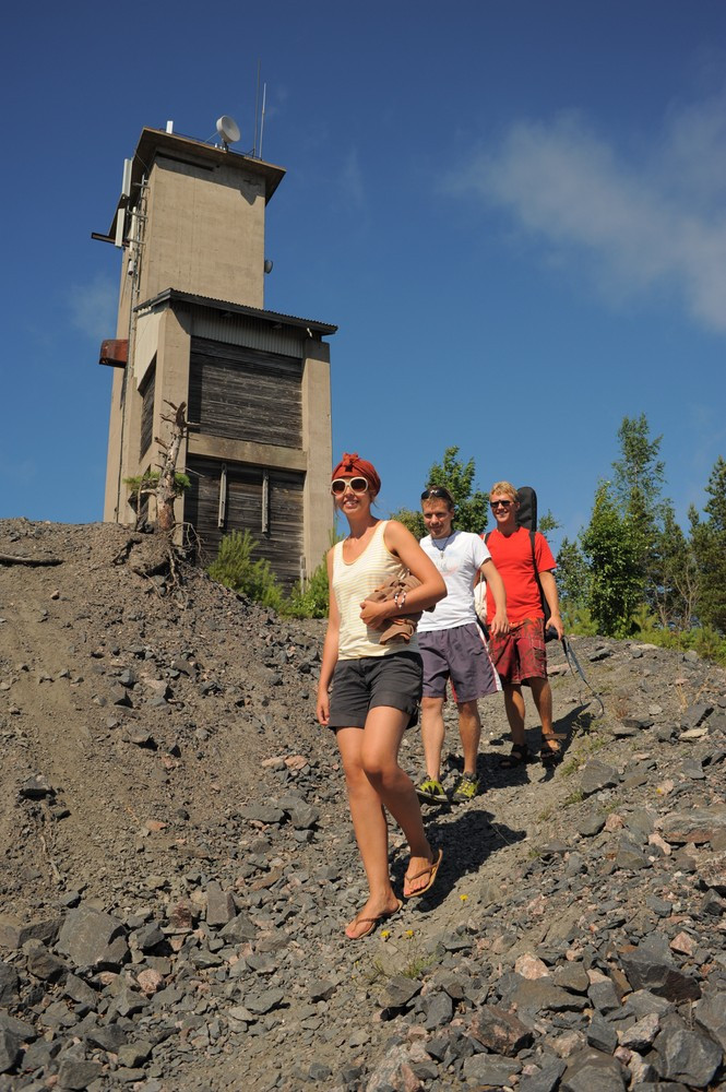 har plats för stora och små båtar. Tvärs över ön finns en svart sandstrand, troligen rester av malmbrytningen.