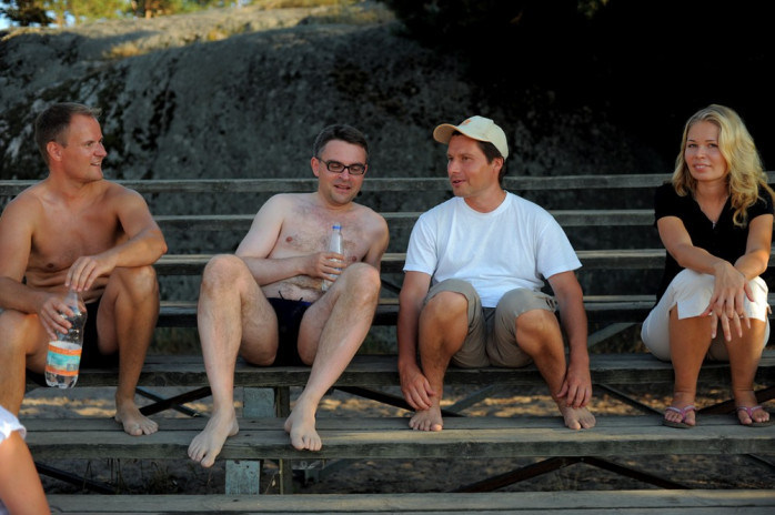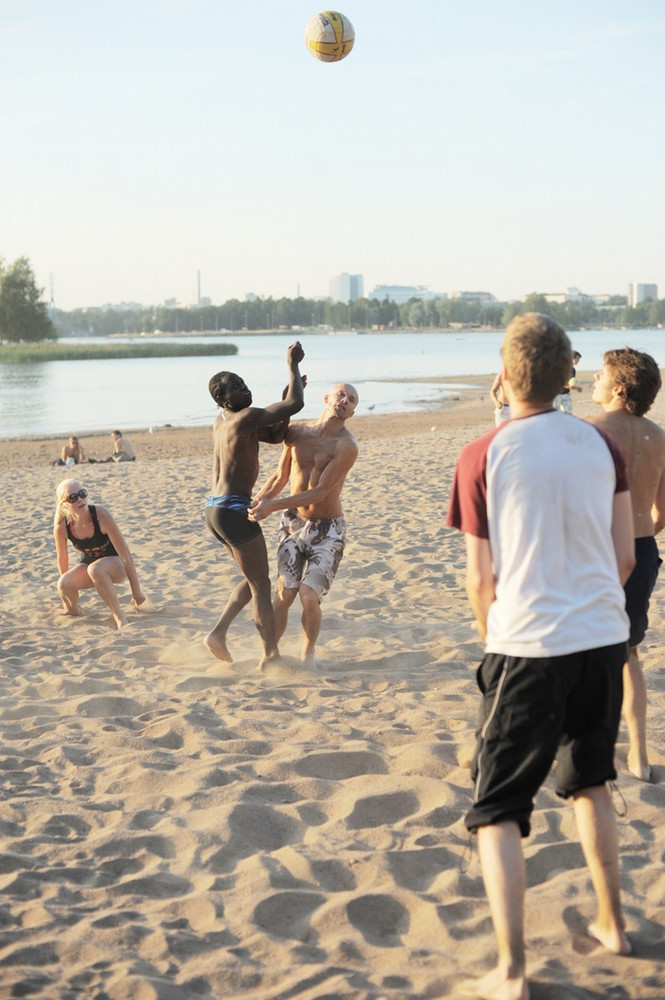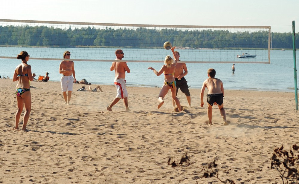 GEMENSKAP. Helsingfors bjuder sina invånare på riktiga pärlor. Värme, sandstrand och vänner. På måndagkvällen var det trångt vid volleybollområdet vid Sandudd, men som vanligt blev det ett plan ledigt just innan Andreas idrottsklubbs beachvolley skulle börja klockan sex.