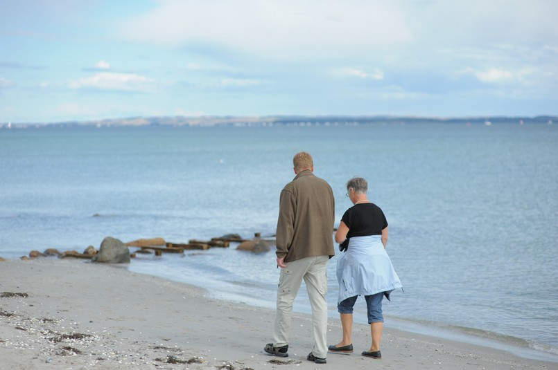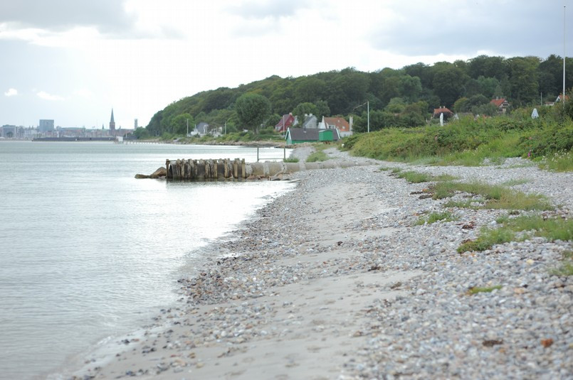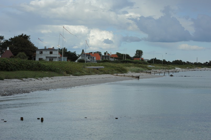 På bilderna finns en vacker strand som är ett populärt stråk för motionärer. Vackra hus ligger nära, men deras gårdar avslutas några meter före stranden, så stranden är fri att gå på. Husen i Danmark är nästan alla av sten och tegel.