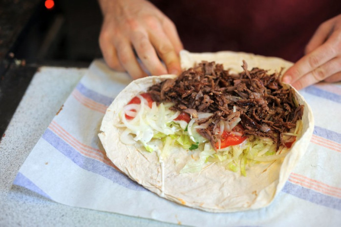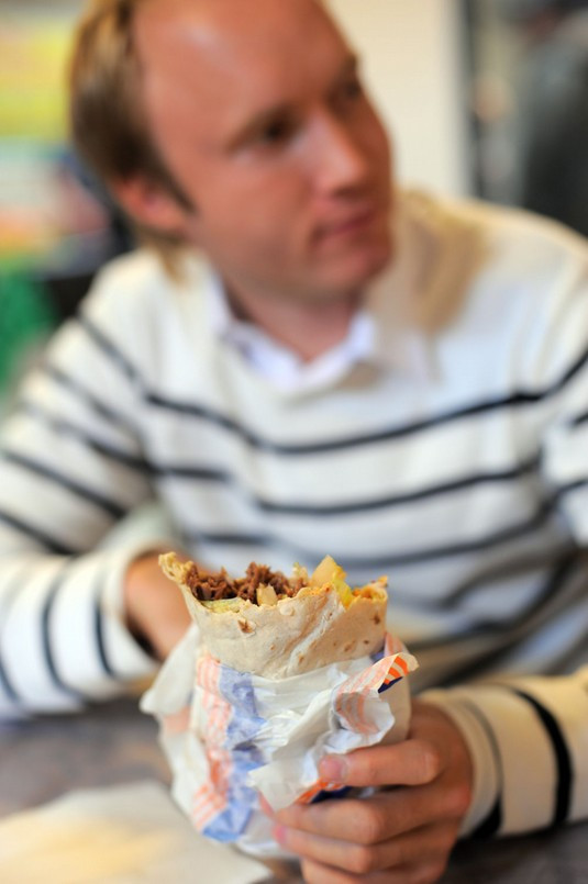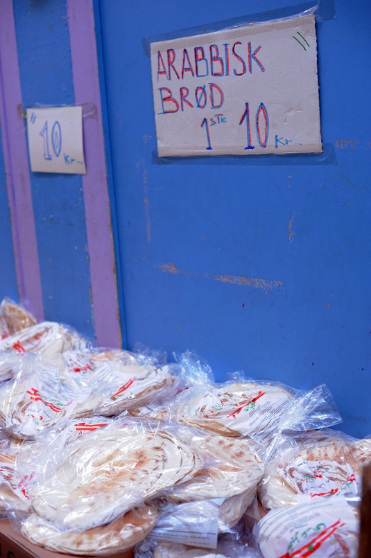 På marknaden fanns flera kebabställen, men ett skyltade med kebabrulle med nybakat bröd för 35 danska kronor (4,70 €) . Kebabköttet är köttbitar som skärs från ett spett, till skillnad från den malda varianten som är populär i Finland.