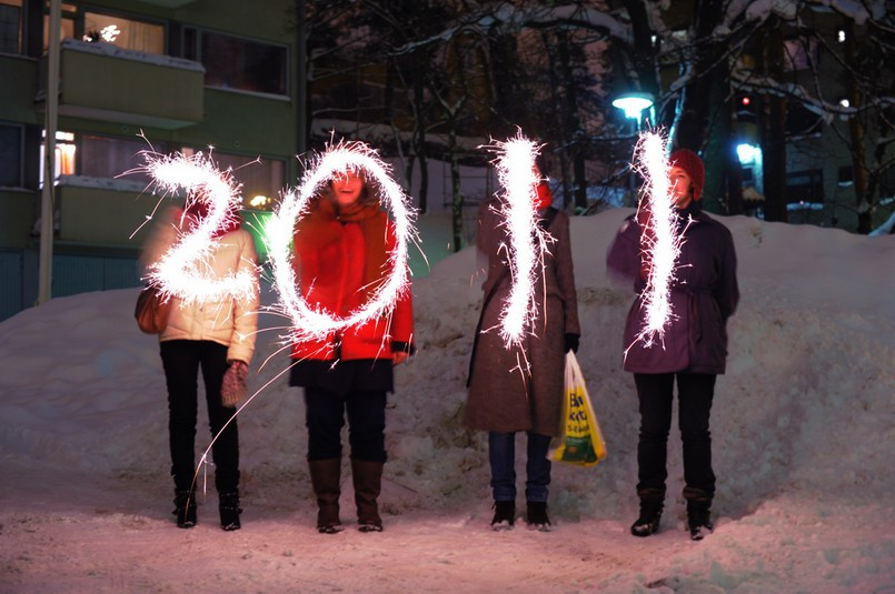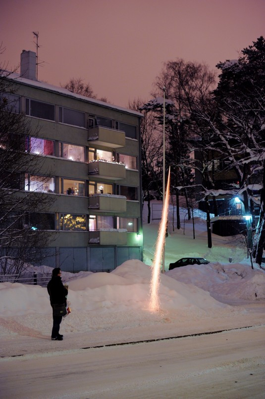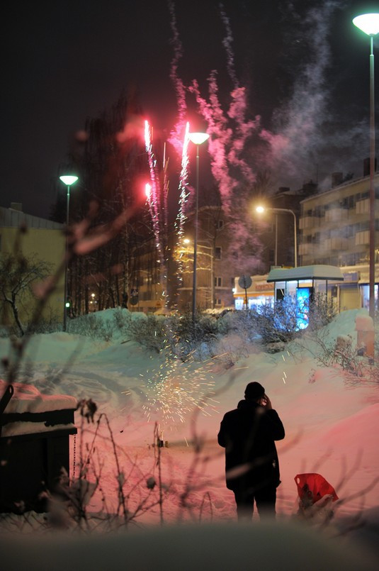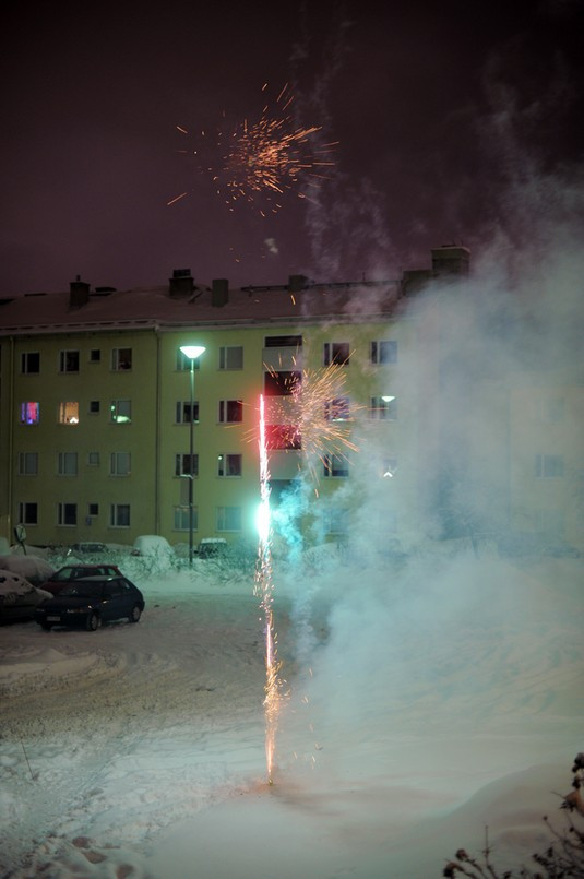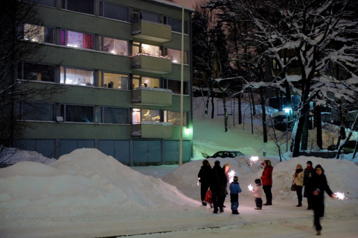 Det var mest prat, singstar och umgänge, men strax innan tolvslaget skruvades TV:n på. I en sändning från senatstorget sjöng massor med människor psalmen Härlig är jorden. Efter det tog stadsdirektören för Helsingfors över för att berätta om Finländarnas exportmöjligheter i snow-how-businessen.
