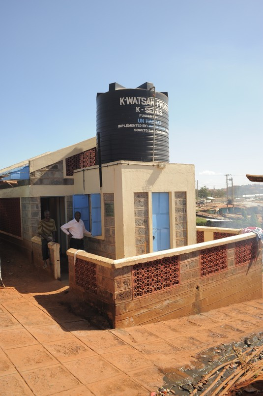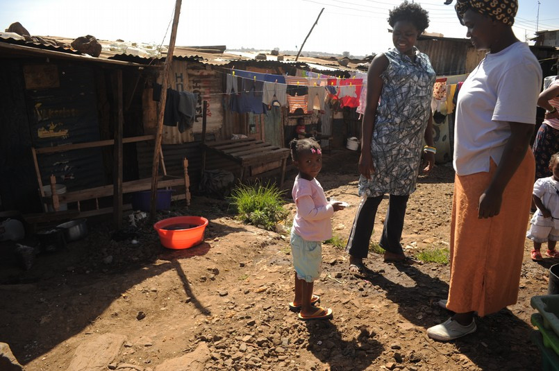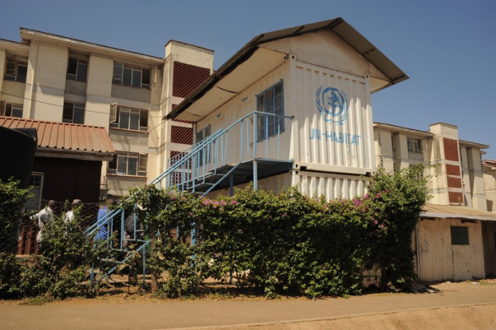 UN HABITAT vid utkanten av slumområdet. I bakgrunden syns nybyggda lägenheter som ersätter slummen.