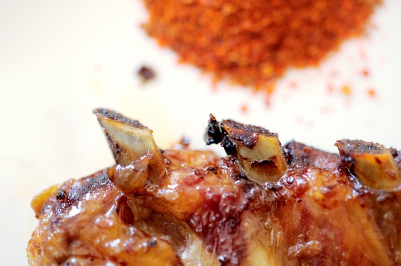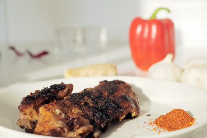 Huvudingrediensen är revbensspjäll av gris. Marinera grisen (>500 gram/person) med rypsolja, två hackade vitlöksklyftor, en matsked med ingefäraflisor, lite sojaolja och rejält (> 1/2 matsked) med starkt chilipulver.