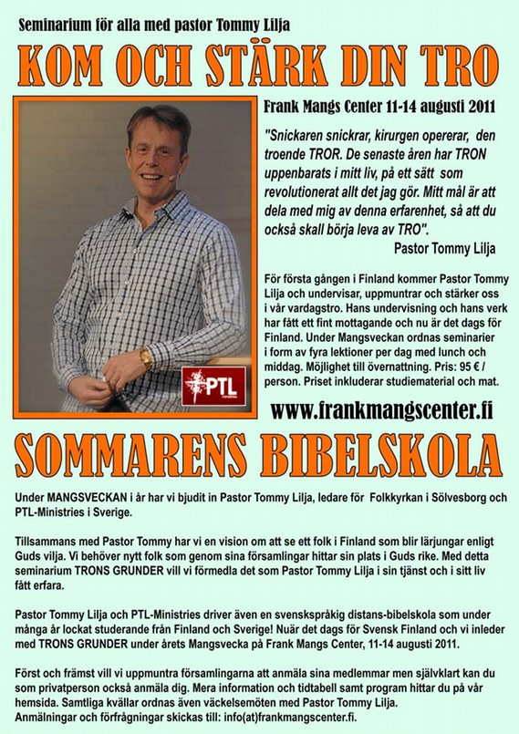 Kvällens predikan av Pastor Tommy Lilja var av den karaktären man inte så ofta får vara med om på våra breddgrader. Kvällens möte var ett ”crusade möte” där han först visade en video från olika möten i tredje världen. Det var gripande att se hur mycket människor som blir frälsta och hur stor nöden är i dessa länder. Speciellt då Tommy berättade om barnen som vid tio års ålder är utsatta för brottslighet och prostitution, droger och sjukdomar. PTL-Ministries ordnar kampanjer och hjälper dessa utsatta barn. Vilket fantastiskt arbete!