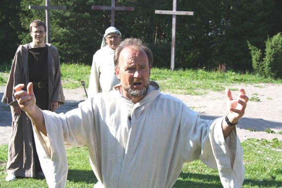 ”Sången om livet”, pjäsen om Frank Mangs liv och budskap som vi spelade 2002-04, gav ny impuls och i höstas ägnade jag två månader åt Markus evangelium. Inspiration hade jag fått av prästen och författaren Boris Salos bok ”Berättarglädje”, som vi i en bibelstudiegrupp vintern 2008-09 hade haft som vägledning. Det är samme Boris Salo som nu i vår pjäs gestaltar Jesus-rollen! Underliga är Guds vägar!