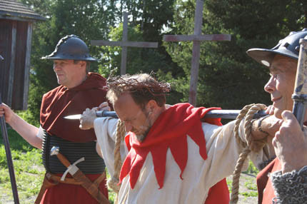 Senaste sommar uppförde vi passionsspelet ” Mästarens väg”, som bygger på Markus evangelium. Manuskriptet har som en röd tråd ett samtal mellan Petrus och Markus.