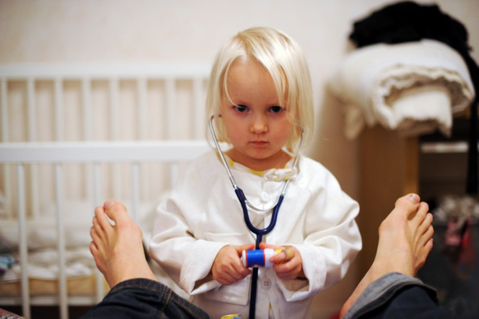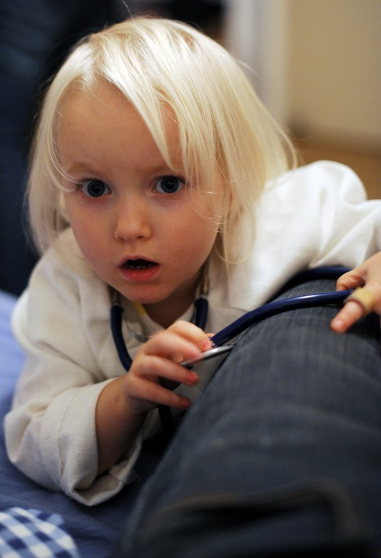 Juni är lite över två och ett halvt år och "doktor"-leken har hört till hennes favoriter i halva hennes liv. Hon har tidigare fått ett läkarpaket med bland annat spruta, blodtrycksmätare och pillerburk. Linus hade svårt att hitta leksaksstetoskop som fungerade så han beställde ett riktigt i liten storlek från Ebay. Det stetoskopet är gjort av gummi och metall och det kan man tydligt höra hjärtljud med.