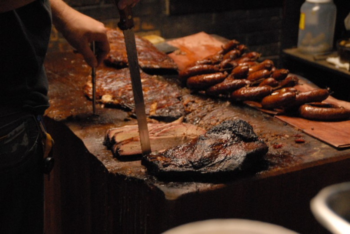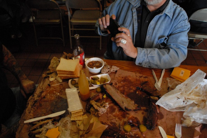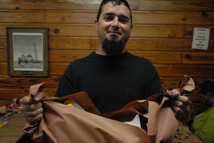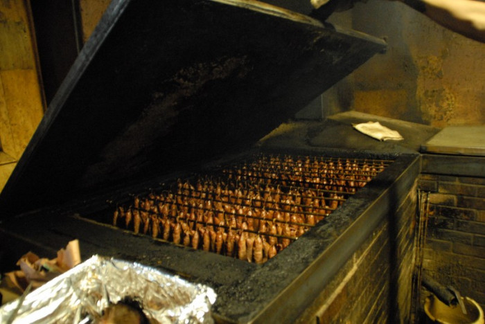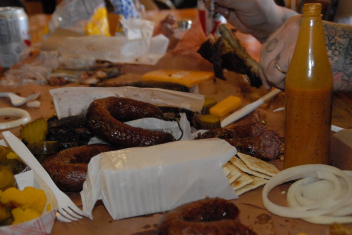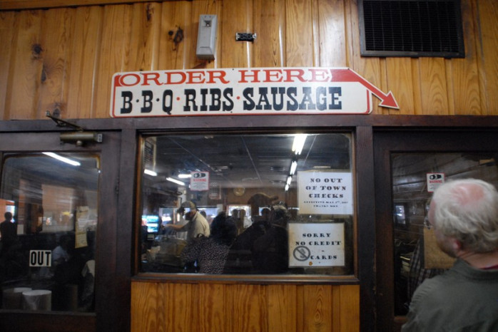 På denna restaurang har man inga tallrikar utan man bär själv ut köttet och korven på ett papper till serveringsrummet där man äter. Vill man ha tillägg som ost, dryck eller bönor måste man gå till en annan disk för att köpa detta.