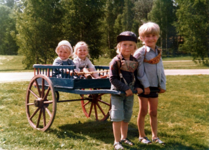 GEMENSKAP. Sommaren 1980 såg det såhär mysigt ut i Koneparken i Munksnäs, Helsingfors. Syskonen Johanna och Marcus leker häst och kärra tillsammans med syskonen Simon och Linus.