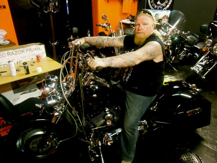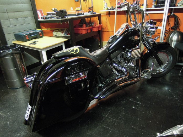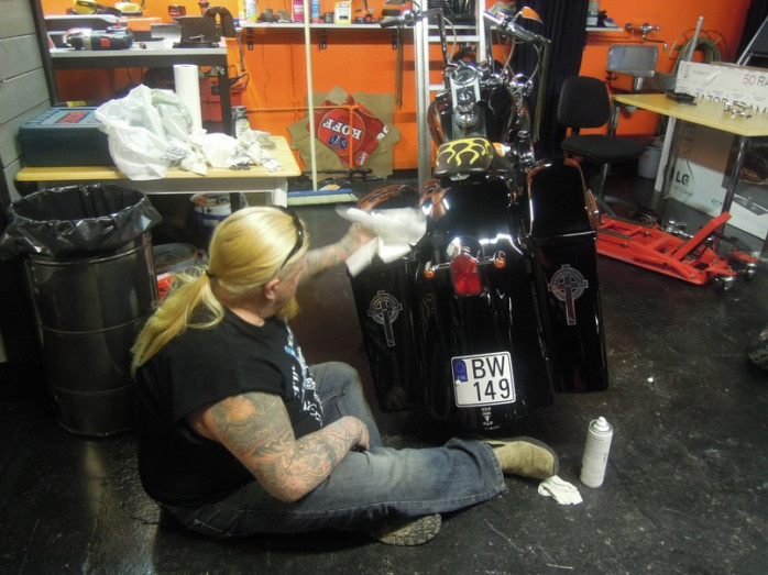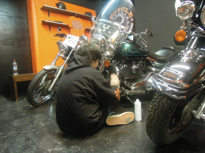 På andra sidan rummet sitter Pontus och polerar sin 2004 Harley Davidson Night Glide Train King eller vad man nu skall kalla den. I grund och botten är det en Night Train men under årens lopp har den modifierats och byggts om. Framändan har bytts ut till en Fat Boy framända och bakdelen har försetts med Bad Dad bakskärm och djupa sidoväskor.