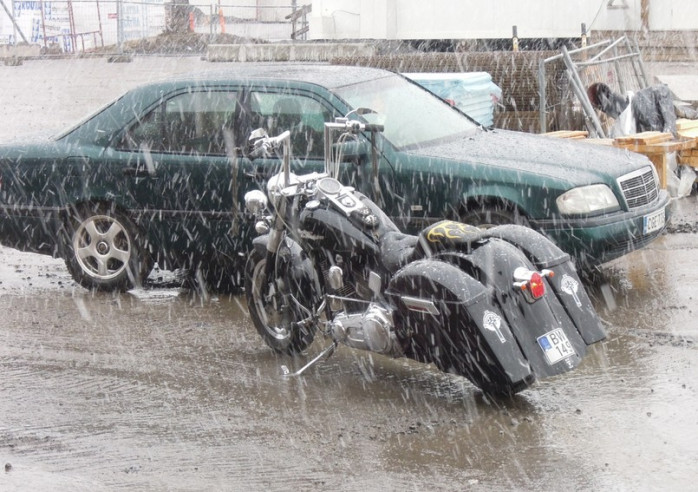 För några dagar sedan publicerade vi en artikel om grabbarna som polerade upp sina motorcyklar inför mässan. I fredags var det dags att köra motorcyklarna till Botniahallen i Korsholm, en bit utanför Vasa. Dagen blev dock inte precis som de hade tänkt sig. Då det var dags att köra till mässan hade det börjat snöa och vädret var mycket slaskigt.