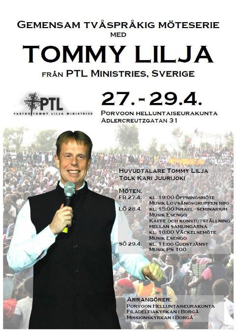 Detta veckoslut besöker Pastor Tommy Lilja, grundade och ledare för PTL-Ministries, Finland igen. Han är också Pastor i Folkkyrkan i Sölvesborg i Blekinge i Sverige. Han rör sig mycket ute i tredje världen och hans tjänst har blivit ett starkt vittnesbörd runt om i världen att tecken verkligen följer den som tror. Otroliga under, tecken och mirakel rapporteras från hans mötesserier, inte bara ute i stora världen utan även från våra breddgrader.