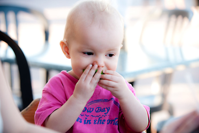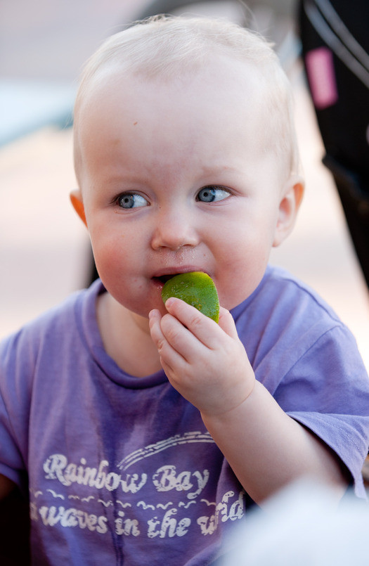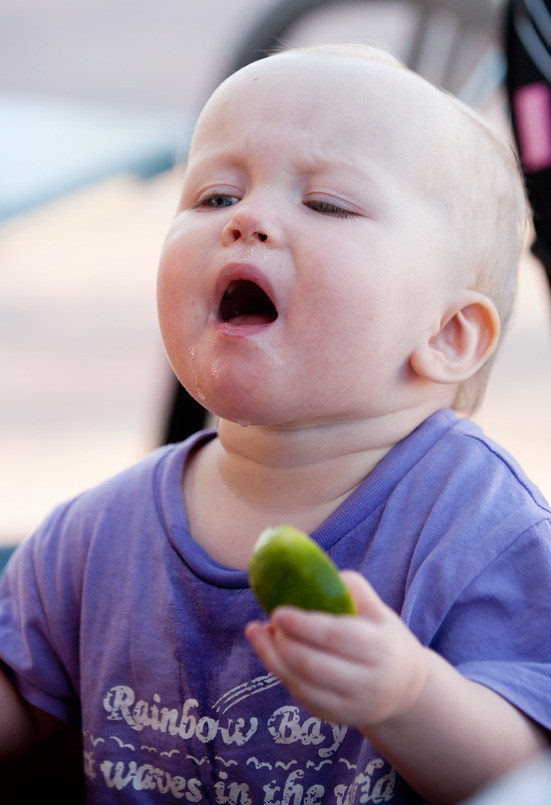 Först bet Jenna i den sura biten och grimaserade och fortsatte äta. Jenna är inte den som lämnar sin syster utanför så hon bjöd Ada på ett smakprov. Ada åt friskt och grimaserade bara lite.