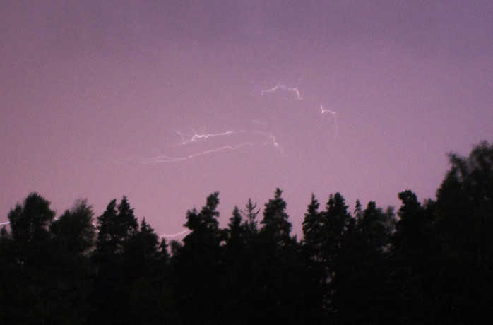 Med sig har han ett fotografi som ser ut att visa en svart skog på natten. Han pekar på blixtarna.