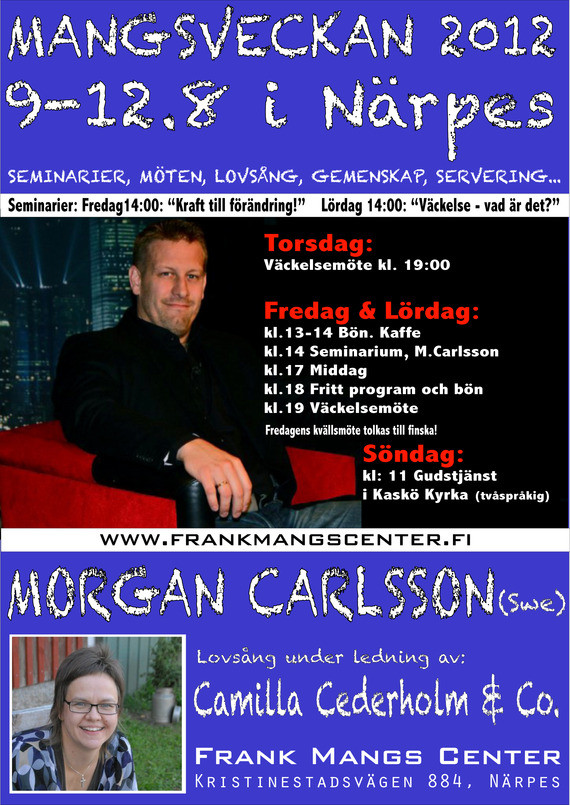 Huvudtalaren för årets Mangsvecka kommer från Sverige och heter Morgan Carlsson. Carlsson är känd som"mannen bakom mediamissionen" som hade ett stort genombrott i bland annat Helsingfors där en stor kristenmedia kampanj ordnades. Carlsson håller seminarier dagtid och på torsdag, fredag och lördag kväll är detväckelsemöten i tröskhuset. Fredagens möte tolkas även till det andra inhemska språket finska. Läs Morgan Carlssons blogg här!