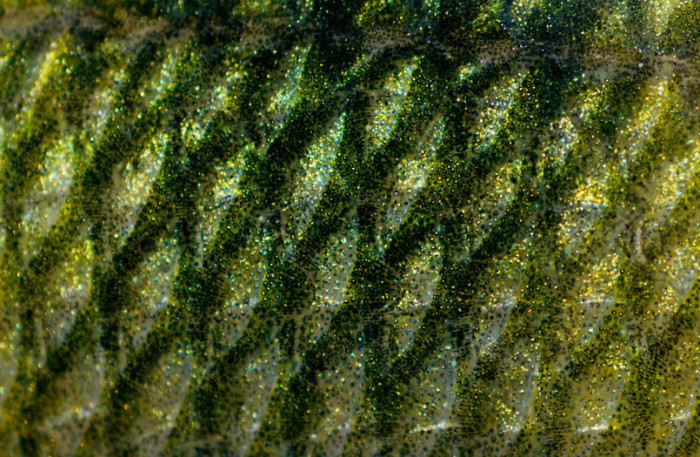 På detaljbilden abborrens vackra fjäll som ser ut att bestå av mängder av små slipade ädelstenar.
