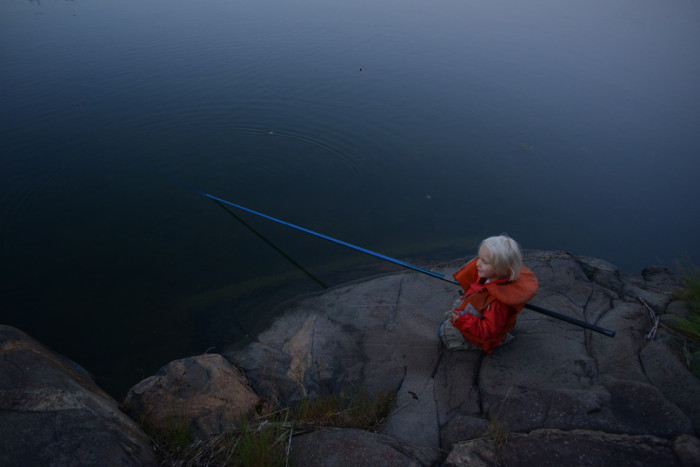 När fafa åkte hem avslutade Juni fiskeriet genom att rulla spöet i vattnet.