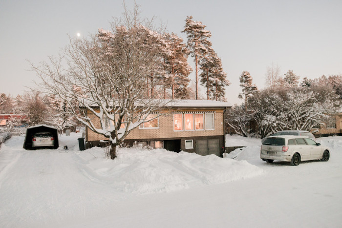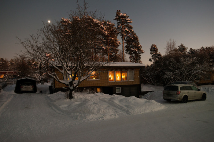 På bilderna syns Christas barndomshem efter att solen gått ner. Ena versionen är bilden i original och andra är en mera ljusterapeutisk version av samma bild.