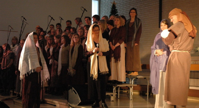 ALLMÄNT 28/12 2007Också i år gavs en stor jultablå i Gamlakarleby stadskyrka. Ca 70 vuxna aktörer, solister, tekniker, dansare var involverade och liksom tidigare hade vi ett levande Jesusbarn!