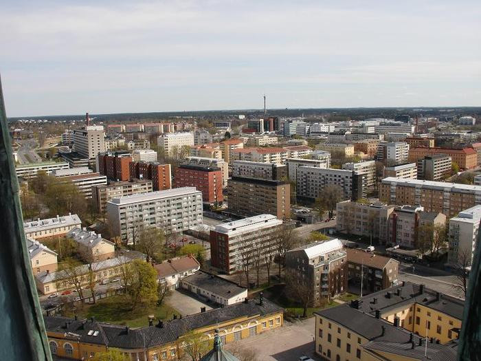 Som tur tog spiraltrappan snart slut men färden fortsatte ännu längs knarrande trätrappor och det gick bara uppåt och uppåt. Vi stannade vid några speciella anhalter som t.ex vid själva klockverket där vi såg den maffiga klockpendeln långsamt ticka av och an och åtminstone jag fick lite känslan av att jag var med i slutscenen i Walt Disney´s film Basil Mus. När vi vidare stegade upp för de oändligt många trappstegen stötte vi även på de massiva kyrkklockorna. Olyckligt nog hade två av klockorna fallit ner under den stora branden i Åbo så de var nu mera ur bruk, men det gjorde som tur ingenting eftersom det är andra klockor högre upp som alltid klämtar med 15min mellan rum så att de lägre ner inte behövde ha prestationsångest.