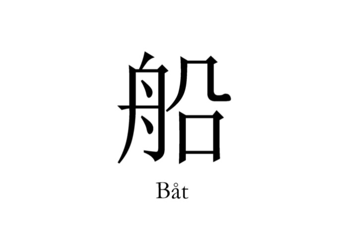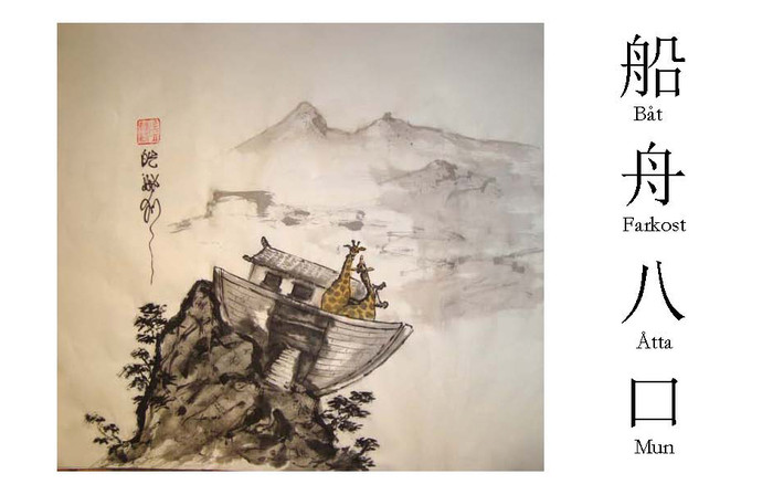 Åtta personer i en farkost. Detta tecken berättar historien om Noas ark och är det absolut vanligaste kinesiska tecknet ännu idag då man talar om sjötrafik.