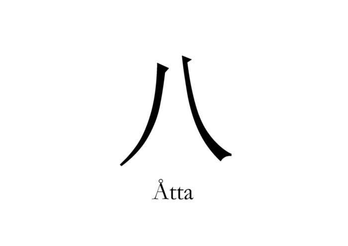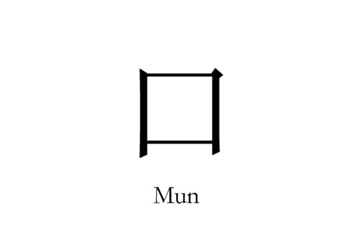 Det första tecknet är tecknet för båt (se bild 2). Detta tecken består av tre delar, delen till vänster är ett fartyg eller en farkost (bild 3). Delen uppe till höger är siffran åtta (bild 4). Delen nere till höger är en mun eller en person (bild 5).