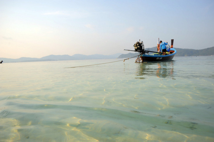 - På förmiddagen var här mycket flera människor, nu när det är ebb har de flesta åkt hem, förklarade styrmannen för longtail båten.