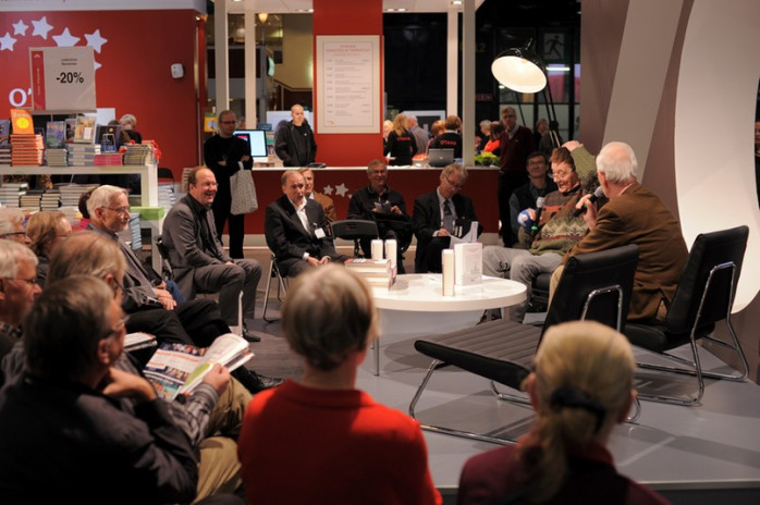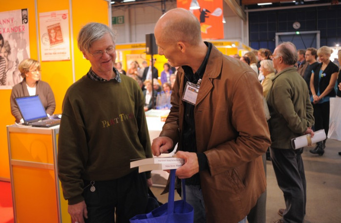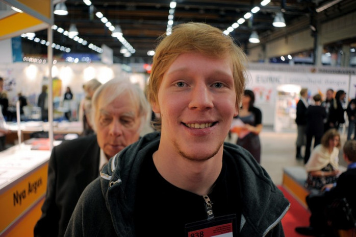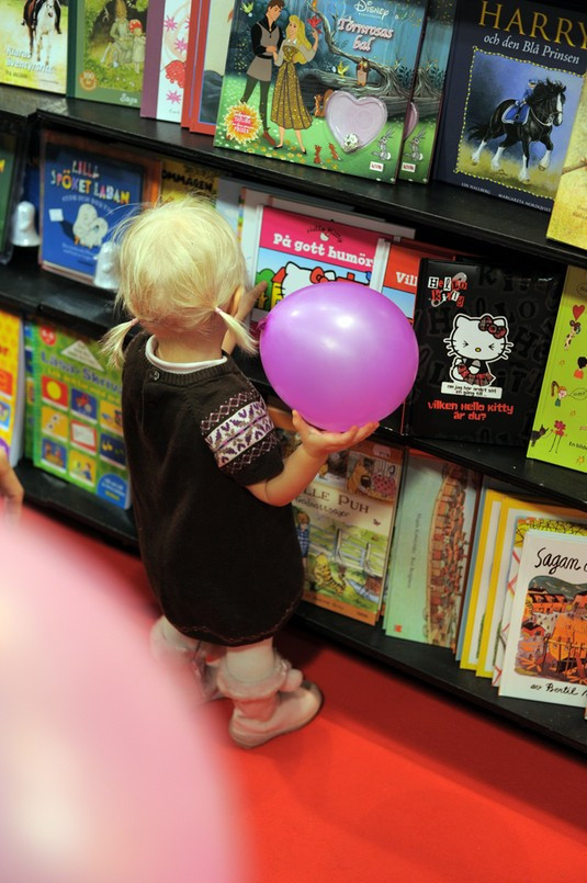- Nej, vi har inget på svenska. Men där borta är svenska litteratursällskapet. De gula montrarna, svarade försäljaren.