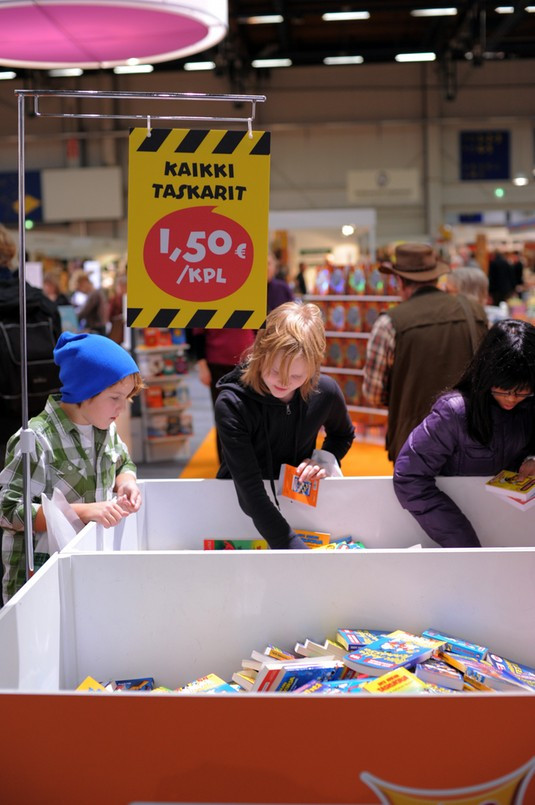 På mässan finns det förstås det mesta i bokälskares smak, gamla och nya böcker. Men här finns också nyare teknik som läsplattor och ljudböcker över internet. Elisas ljudböcker kommer utan kopieringsskydd och går man med i Facebook-gruppen får man dessutom en finskspråkig ljudbok gratis i månaden. För barn och andra ungdomligt sinnade finns det mängder med barnböcker och färglada alster att glädja sig av. Förlaget WSOY hade flera Don Rosas Kalle Anka-album, men tyvärr endast på finska.