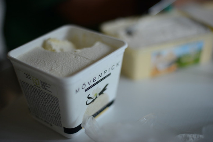 Mövenpicks glass innehöll, till Linus stora förvåning, grädde som huvudingrediens. Grädde stod först i innehållsförteckningen.