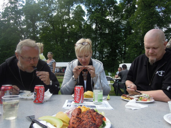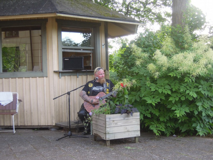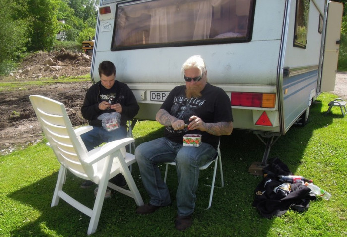 Innan de fick sina rum så vilade de sig i det gröna gräset en stund ända tills Ulf Mannebäck kom med ett förtroendefullt uppdrag åt dem. De skulle rensa jordgubbar. Senare under dagen kom Jukka Mäkikangas tillsammans med Lennart och Zet från Göteborg. De tillhör bandet Betels som är förknippat med Betelskeppet i Göteborg och under kvällen spelade de tillsammans med Pontus. En fin start på mc-träffen.